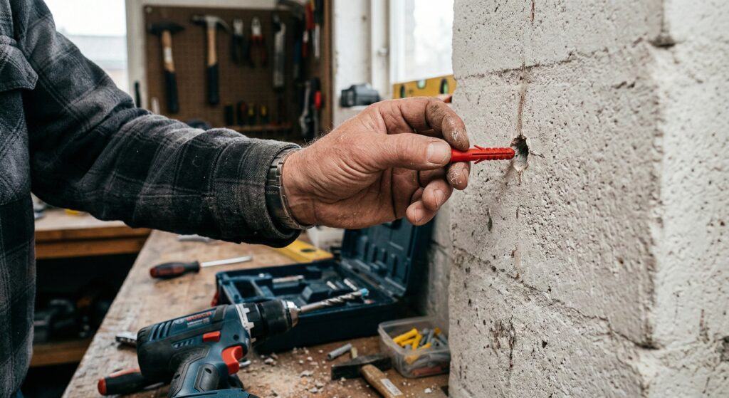 Faça furos com profundidade ligeiramente maior que o comprimento da bucha (cerca de 5mm a mais). Limpe o pó do furo com um soprador ou aspirador. Insira as buchas delicadamente, batendo levemente com um martelo de borracha até ficarem niveladas com a parede.