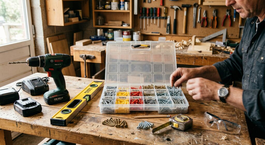 - Buchas apropriadas (plásticas para alvenaria, metálicas para drywall)